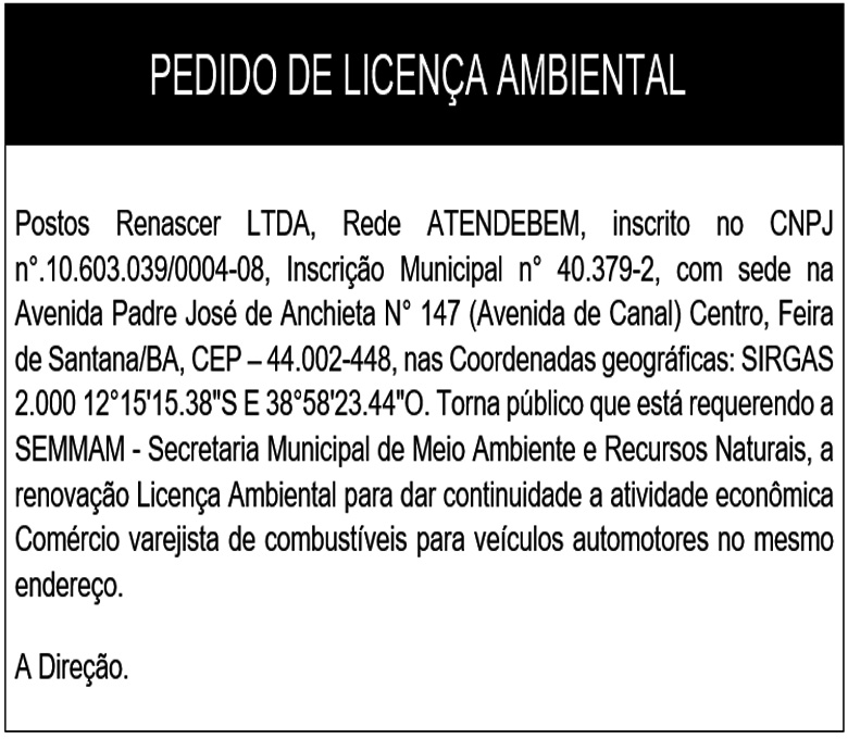 Postos Renascer LTDA, Rede ATENDEBEM, inscrito no CNPJ    n°.10.603.039/0004-08, Inscrição Municipal n° 40.379-2, com sede na Avenida Padre José de Anchieta N° 147 (Avenida de Canal) Centro, Feira de Santana/BA, CEP – 44.002-448, nas Coordenadas geográficas: SIRGAS 2.000 12°15'15.38"S E 38°58'23.44"O. Torna público que está requerendo a SEMMAM - Secretaria Municipal de Meio Ambiente e Recursos Naturais, a renovação Licença Ambiental para dar continuidade a atividade econômica Comércio varejista de combustíveis para veículos automotores no mesmo endereço.