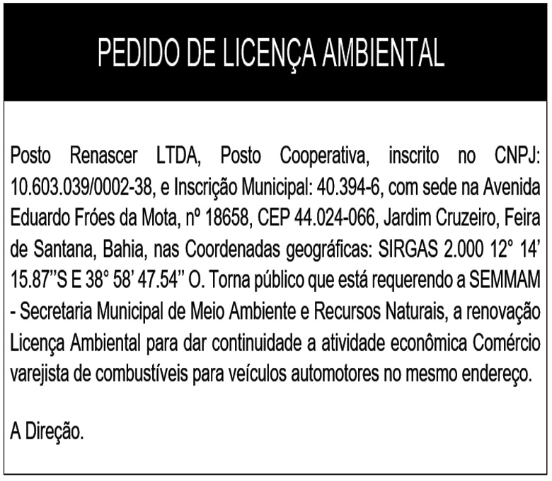 Posto Renascer LTDA, Posto Cooperativa, inscrito no CNPJ: 10.603.039/0002-38, e Inscrição Municipal: 40.394-6, com sede na Avenida  Eduardo Fróes da Mota, nº 18658, CEP 44.024-066, Jardim Cruzeiro, Feira de Santana, Bahia, nas Coordenadas geográficas: SIRGAS 2.000 12° 14’ 15.87’’S E 38° 58’ 47.54’’ O. Torna público que está requerendo a SEMMAM - Secretaria Municipal de Meio Ambiente e Recursos Naturais, a renovação Licença Ambiental para dar continuidade a atividade econômica Comércio varejista de combustíveis para veículos automotores no mesmo endereço.