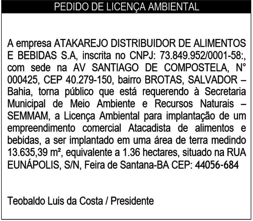 A empresa ATAKAREJO DISTRIBUIDOR DE ALIMENTOS E BEBIDAS S.A, inscrita no CNPJ: 73.849.952/0001-58:, com sede na AV SANTIAGO DE COMPOSTELA, N° 000425, CEP 40.279-150, bairro BROTAS, SALVADOR – Bahia, torna público que está requerendo à Secretaria Municipal de Meio Ambiente e Recursos Naturais – SEMMAM, a Licença Ambiental para implantação de um empreendimento comercial Atacadista de alimentos e bebidas, a ser implantado em uma área de terra medindo 13.635,39 m², equivalente a 1.36 hectares, situado na RUA EUNÁPOLIS, S/N, Feira de Santana-BA CEP: 44056-684