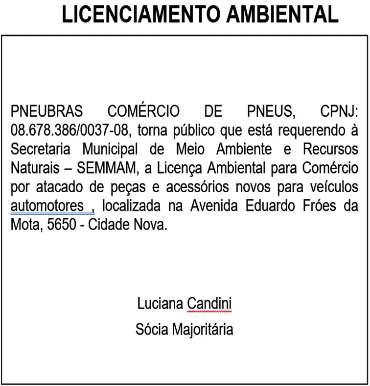 PNEUBRAS COMÉRCIO DE PNEUS, CPNJ: 08.678.386/0037-08, torna público que está requerendo à Secretaria Municipal de Meio Ambiente e Recursos Naturais – SEMMAM, a Licença Ambiental para Comércio por atacado de peças e acessórios novos para veículos automotores , localizada na Avenida Eduardo Fróes da Mota, 5650 - Cidade Nova.