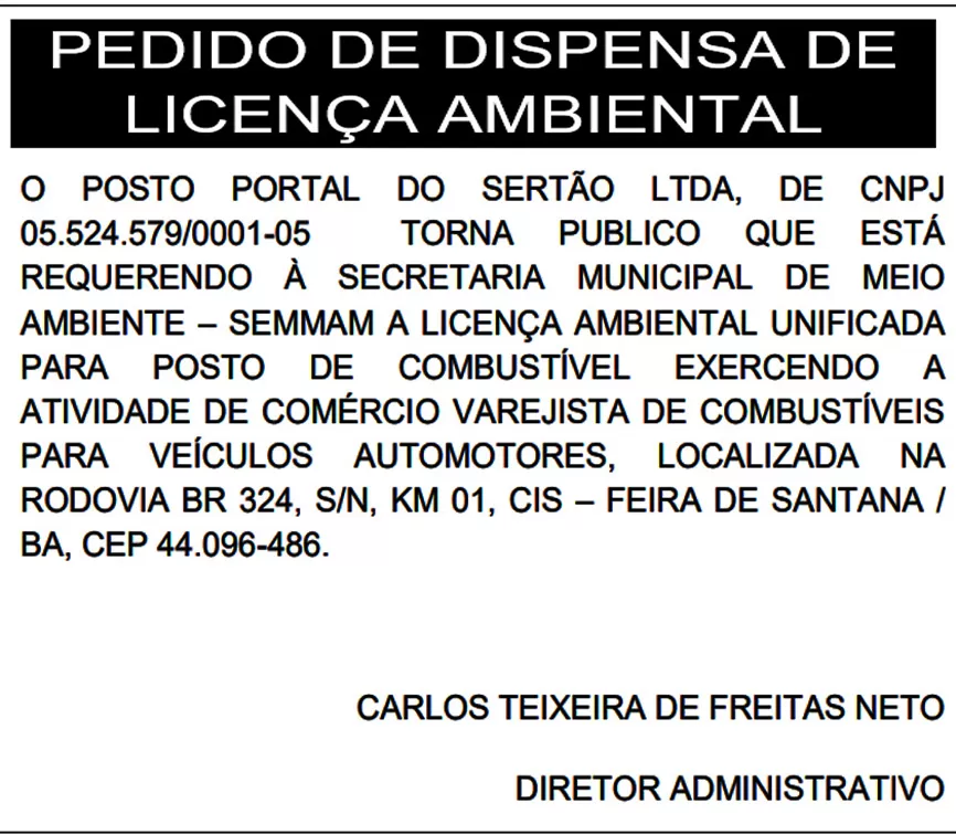 O POSTO PORTAL DO SERTÃO LTDA, de CNPJ 05.524.579/0001-05 torna público que está requerendo à secretaria municipal de meio ambiente – SEMMAM a licença ambiental unificada para posto de combustível exercendo a atividade de comércio varejista de combustíveis para veículos automotores, localizada na rodovia BR 324, s/n, km 01, CIS – Feira de Santana / BA, CEP 44.096-486.