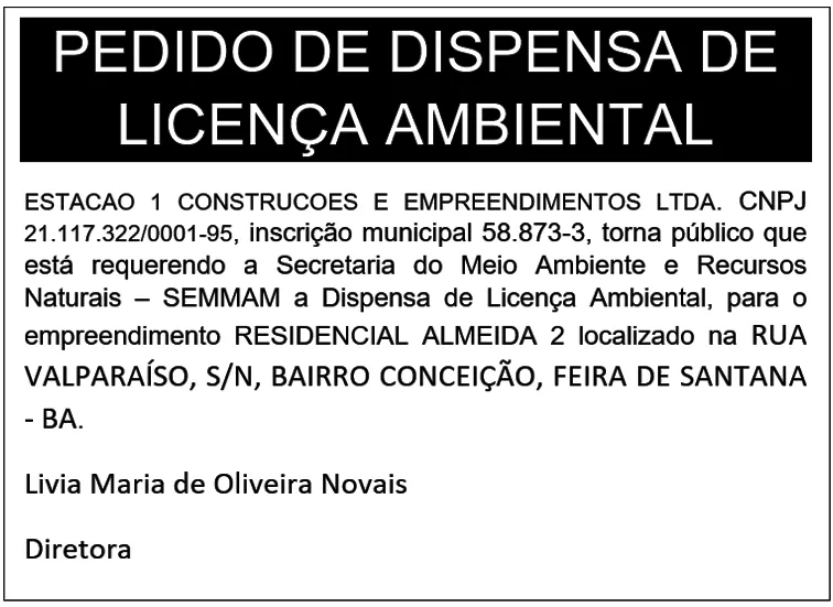 ESTACAO 1 CONSTRUCOES E EMPREENDIMENTOS LTDA. CNPJ 21.117.322/0001-95, inscrição municipal 58.873-3, torna público que está requerendo a Secretaria do Meio Ambiente e Recursos Naturais – SEMMAM a Dispensa de Licença Ambiental, para o empreendimento RESIDENCIAL ALMEIDA 2 localizado na RUA VALPARAÍSO, S/N, BAIRRO CONCEIÇÃO, FEIRA DE SANTANA - BA.