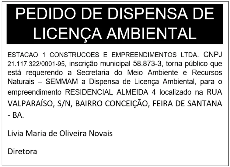 ESTACAO 1 CONSTRUCOES E EMPREENDIMENTOS LTDA. CNPJ 21.117.322/0001-95, inscrição municipal 58.873-3, torna público que está requerendo a Secretaria do Meio Ambiente e Recursos Naturais – SEMMAM a Dispensa de Licença Ambiental, para o empreendimento RESIDENCIAL ALMEIDA 4 localizado na RUA VALPARAÍSO, S/N, BAIRRO CONCEIÇÃO, FEIRA DE SANTANA - BA.