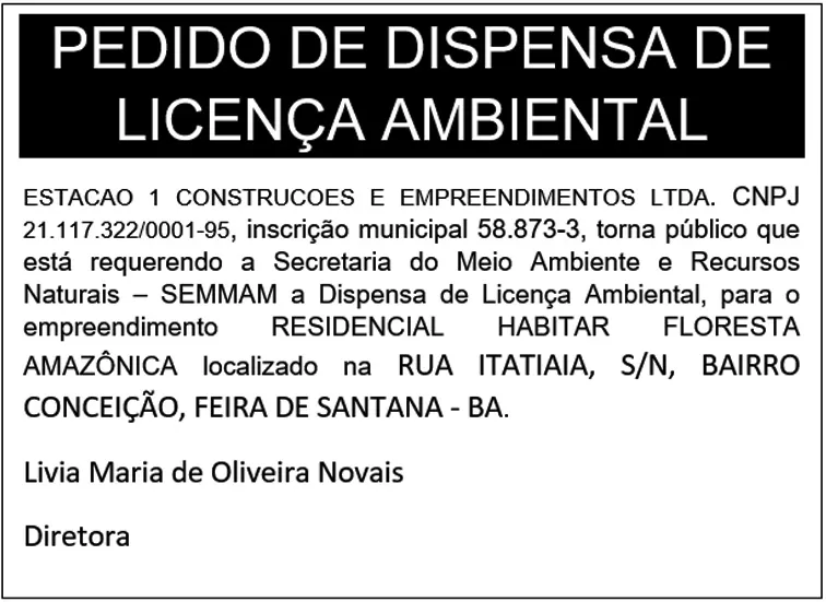 ESTACAO 1 CONSTRUCOES E EMPREENDIMENTOS LTDA. CNPJ 21.117.322/0001-95, inscrição municipal 58.873-3, torna público que está requerendo a Secretaria do Meio Ambiente e Recursos Naturais – SEMMAM a Dispensa de Licença Ambiental, para o empreendimento RESIDENCIAL HABITAR FLORESTA AMAZÔNICA localizado na RUA ITATIAIA, S/N, BAIRRO CONCEIÇÃO, FEIRA DE SANTANA - BA.