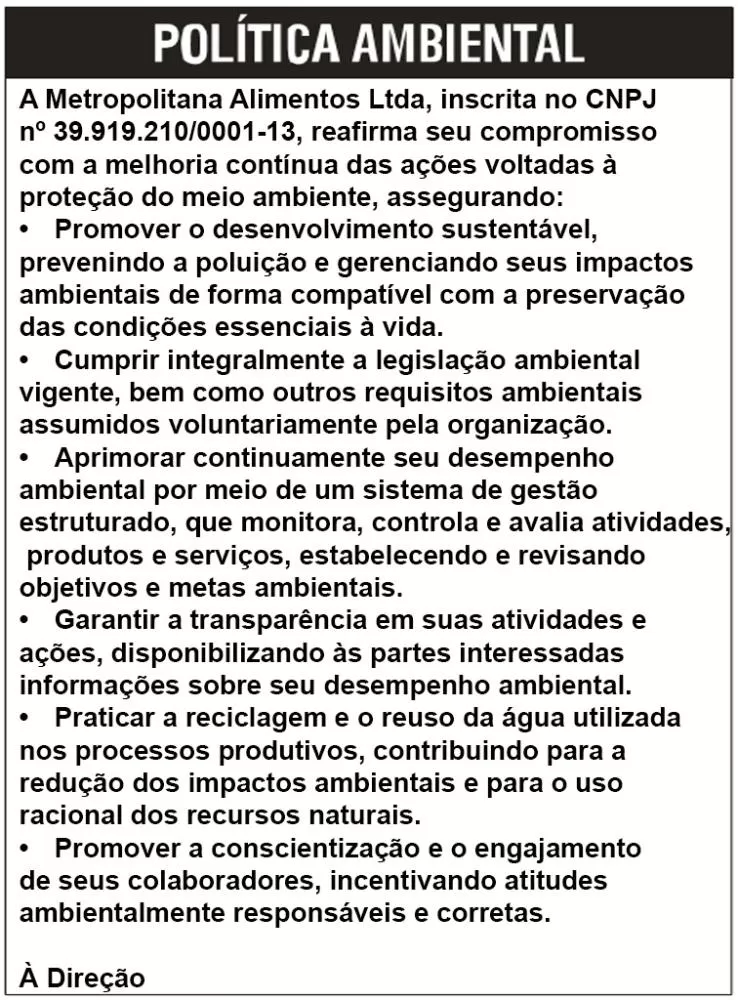 A METROPOLITANA ALIMENTOS LTDA, DE CNPJ 39.919.210/0001-13, TORNA PÚBLICO QUE ESTÁ REQUERENDO Á SECRETARIA MUNICIPAL DE MEIO AMBIENTE- SEMMAM, A LICENÇA AMBIENTAL UNIFICADA PARA COMÉRCIO ATACADISTA DE PRODUTOS ALIMENTÍCIOS EM GERAL, LOCALIZADA NA AV DEPUTADO LUIS EDUARDO MAGALHÃES S/N – BR 324 KM 524, CEP: 44.079-002, FEIRA DE SANTANA- BA