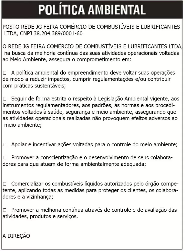 REDE JG FEIRA COMÉRCIO DE COMBUSTÍVEIS E LUBRIFICANTES LTDA, CNPJ 38.204.389/0001-60 torna público que está requerendo à Secretaria Municipal de Meio Ambiente e Recursos Naturais – SEMMAM, a Licença Unificada para a operação de comércio varejista de combustíveis para veículos automotores, localizado na Rua José Joaquim Seabra, 410, Centro, Feira de Santana – BA. CEP: 44.002-000.