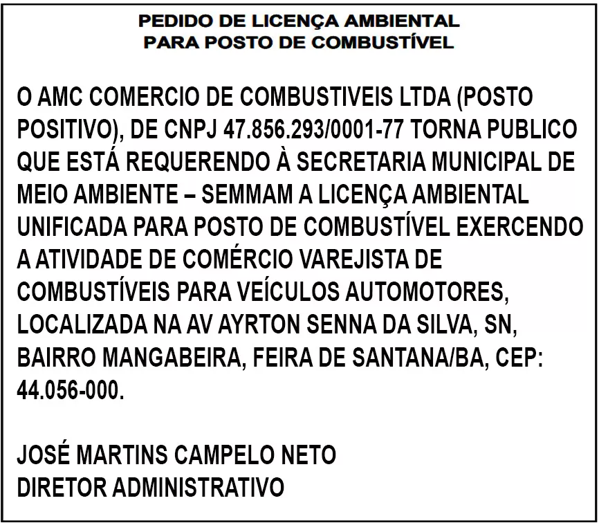 O AMC COMERCIO DE COMBUSTIVEIS LTDA (POSTO POSITIVO), DE CNPJ 47.856.293/0001-77 TORNA PUBLICO QUE ESTÁ REQUERENDO À SECRETARIA MUNICIPAL DE MEIO AMBIENTE – SEMMAM A LICENÇA AMBIENTAL UNIFICADA PARA POSTO DE COMBUSTÍVEL EXERCENDO A ATIVIDADE DE COMÉRCIO VAREJISTA DE COMBUSTÍVEIS PARA VEÍCULOS AUTOMOTORES, LOCALIZADA NA AV AYRTON SENNA DA SILVA, SN, BAIRRO MANGABEIRA, FEIRA DE SANTANA/BA, CEP: 44.056-000.
