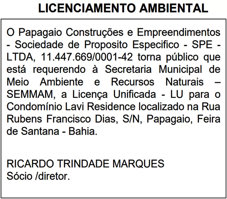 O Papagaio Construções e Empreendimentos - Sociedade de Proposito Especifico - SPE - LTDA, 11.447.669/0001-42 torna público que está requerendo à Secretaria Municipal de Meio Ambiente e Recursos Naturais – SEMMAM, a Licença Unificada - LU para o Condomínio Lavi Residence localizado na Rua Rubens Francisco Dias, S/N, Papagaio, Feira de Santana - Bahia.