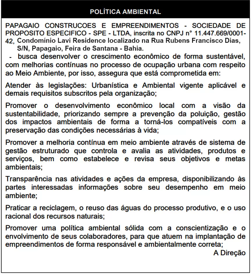 O Papagaio Construções e Empreendimentos - Sociedade de Proposito Especifico - SPE - LTDA, 11.447.669/0001-42 torna público que está requerendo à Secretaria Municipal de Meio Ambiente e Recursos Naturais – SEMMAM, a Licença Unificada - LU para o Condomínio Lavi Residence localizado na Rua Rubens Francisco Dias, S/N, Papagaio, Feira de Santana - Bahia.