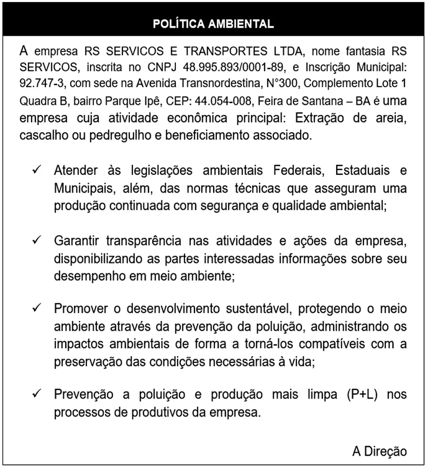 A empresa RS SERVICOS E TRANSPORTES LTDA nome fantasia RS SERVICOS, inscrita no CNPJ 48.995.893/0001-89, e Inscrição Municipal: 92.747-3, com sede na Avenida Transnordestina, N°300, Complemento Lote 1 Quadra B, bairro Parque Ipê, CEP: 44.054-008, Feira de Santana – BA, atividade econômica principal: Extração de areia, cascalho ou pedregulho e beneficiamento associado. Torna público que está requerendo à Secretaria Municipal de Meio Ambiente e Recursos Naturais – SEMMAM, a Licença Ambiental para desenvolver a atividade de extração do minério, areia a céu aberto, em propriedade rural denominada Fazenda Jenipapo, Matrícula 078.227, com área total de 1,3068 hectares, dentro de uma Poligonal de Extração de 4,55 hectares com produção média anual de 36.000 toneladas/ano. A poligonal possui um Ponto de Amarração (PA) no vértice 01 da poligonal: Latitude: -12°06'25''562/ Longitude --38°56'50''008. No endereço: Fazenda Jenipapo, S/N, Tiquaruçu, Feira de Santana – Bahia, nas coordenadas Geográficas (GMS) 12° 6'30.81"S e 38°56'51.85"O.