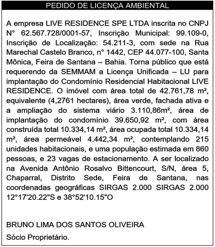 A empresa LIVE RESIDENCE SPE LTDA inscrita no CNPJ N° 62.567.728/0001-57, Inscrição Municipal: 99.109-0, Inscrição de Localização: 54.211-3, com sede na Rua Marechal Castelo Branco, n° 1442, CEP 44.077-100, Santa Mônica, Feira de Santana – Bahia. Torna público que está requerendo da SEMMAM a Licença Unificada – LU para implantação do Condomínio Residencial Habitacional LIVE RESIDENCE. O imóvel com área total de 42.761,78 m², equivalente (4,2761 hectares), área verde, fachada ativa e a ampliação do sistema viário 3.110,86m², área de implantação do condomínio 39.650,92 m², com área construída total 10.334,14 m², área ocupada total 10.334,14 m², área permeável 4.442,34 m², contemplando 215 unidades habitacionais, e uma população estimada em 860 pessoas, e 23 vagas de estacionamento. A ser localizado na Avenida Antônio Rosalvo Bittencourt, S/N, área 5, Chaparral, Distrito Sede, Feira de Santana, nas coordenadas geográficas SIRGAS 2.000 SIRGAS 2.000 12°17'20.22"S e 38°52'10.15"O