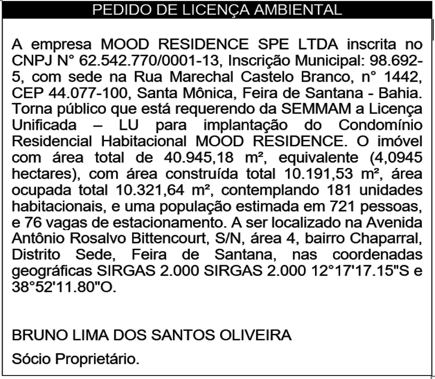 A empresa MOOD RESIDENCE SPE LTDA inscrita no CNPJ N° 62.542.770/0001-13, Inscrição Municipal: 98.692-5, com sede na Rua Marechal Castelo Branco, n° 1442, CEP 44.077-100, Santa Mônica, Feira de Santana - Bahia. Torna público que está requerendo da SEMMAM a Licença Unificada – LU para implantação do Condomínio Residencial Habitacional MOOD RESIDENCE. O imóvel com área total de 40.945,18 m², equivalente (4,0945 hectares), com área construída total 10.191,53 m², área ocupada total 10.321,64 m², contemplando 181 unidades habitacionais, e uma população estimada em 721 pessoas, e 76 vagas de estacionamento. A ser localizado na Avenida Antônio Rosalvo Bittencourt, S/N, área 4, bairro Chaparral, Distrito Sede, Feira de Santana, nas coordenadas geográficas SIRGAS 2.000 SIRGAS 2.000 12°17'17.15"S e 38°52'11.80"O.