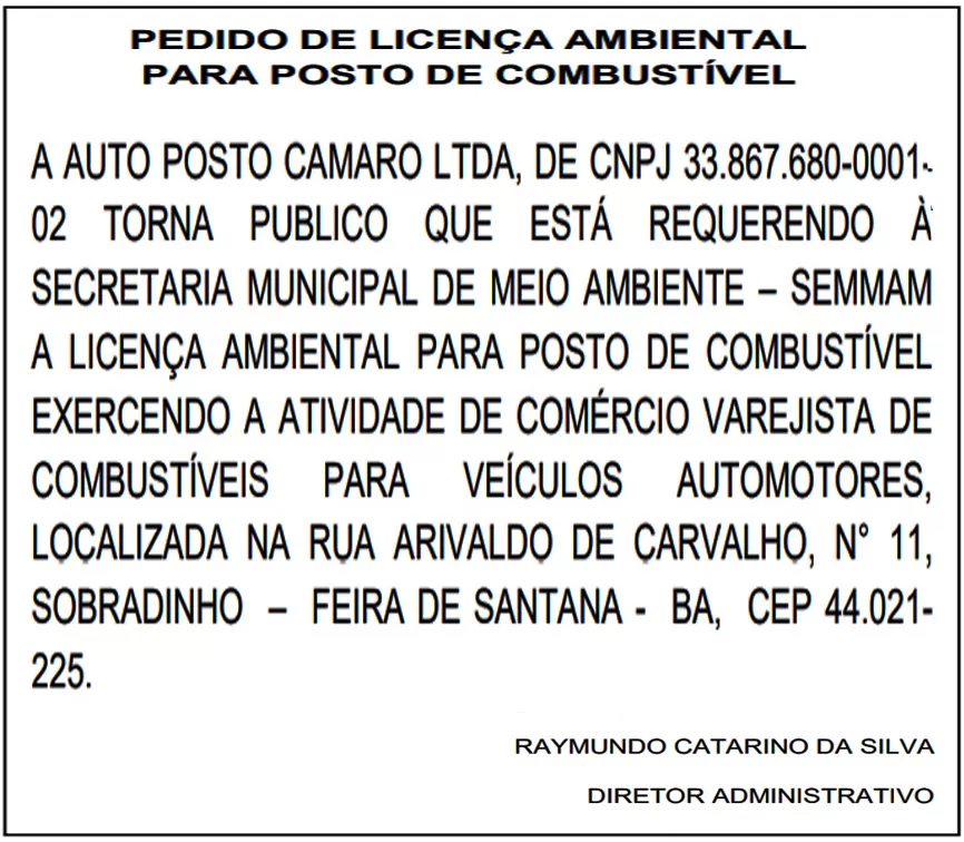 A AUTO POSTO CAMARO LTDA, DE CNPJ 33.867.680-0001- 02 TORNA PUBLICO QUE ESTÁ REQUERENDO À SECRETARIA MUNICIPAL DE MEIO AMBIENTE – SEMMAM A LICENÇA AMBIENTAL PARA POSTO DE COMBUSTÍVEL EXERCENDO A ATIVIDADE DE COMÉRCIO VAREJISTA DE COMBUSTÍVEIS PARA VEÍCULOS AUTOMOTORES, LOCALIZADA NA RUA ARIVALDO DE CARVALHO, N° 11, SOBRADINHO – FEIRA DE SANTANA - BA, CEP 44.021- 225.