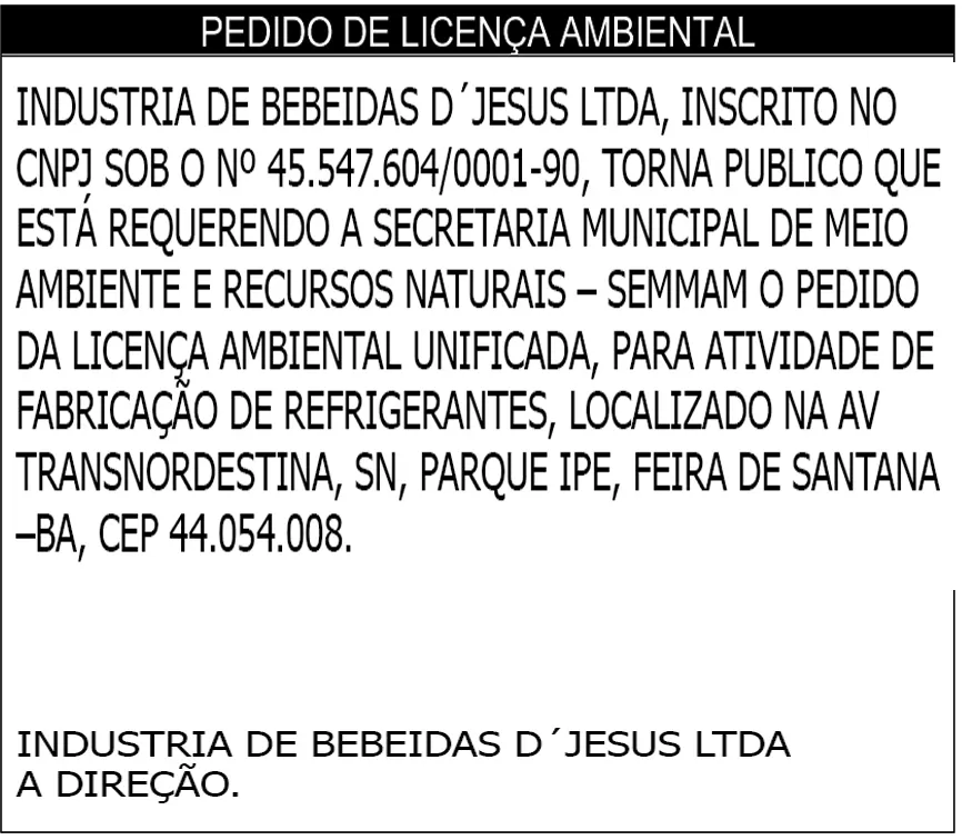 INDUSTRIA DE BEBEIDAS D´JESUS LTDA, INSCRITO NO CNPJ SOB O Nº 45.547.604/0001-90, TORNA PUBLICO QUE ESTÁ REQUERENDO A SECRETARIA MUNICIPAL DE MEIO AMBIENTE E RECURSOS NATURAIS – SEMMAM O PEDIDO DA LICENÇA AMBIENTAL UNIFICADA, PARA ATIVIDADE DE FABRICAÇÃO DE REFRIGERANTES, LOCALIZADO NA AV TRANSNORDESTINA, SN, PARQUE IPE, FEIRA DE SANTANA –BA, CEP 44.054.008.
