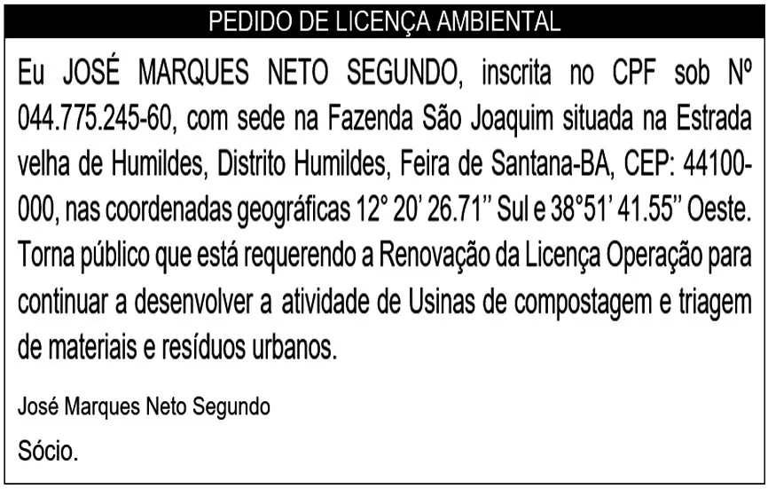 JOSÉ MARQUES NETO SEGUNDO, inscrita no CPF sob Nº 044.775.245-60, com sede na Fazenda São Joaquim situada na Estrada velha de Humildes, Distrito Humildes, Feira de Santana-BA, CEP: 44100-000, nas coordenadas geográficas 12° 20’ 26.71’’ Sul e 38°51’ 41.55’’ Oeste. Torna público que está requerendo a Renovação da Licença Operação para continuar a desenvolver a atividade de Usinas de compostagem e triagem de materiais e resíduos urbanos.