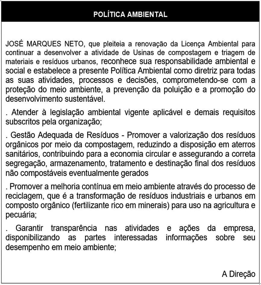 JOSÉ MARQUES NETO SEGUNDO, inscrita no CPF sob Nº 044.775.245-60, com sede na Fazenda São Joaquim situada na Estrada velha de Humildes, Distrito Humildes, Feira de Santana-BA, CEP: 44100-000, nas coordenadas geográficas 12° 20’ 26.71’’ Sul e 38°51’ 41.55’’ Oeste. Torna público que está requerendo a Renovação da Licença Operação para continuar a desenvolver a atividade de Usinas de compostagem e triagem de materiais e resíduos urbanos.