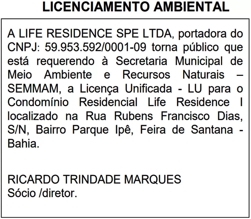 A LIFE RESIDENCE SPE LTDA, portadora do CNPJ: 59.953.592/0001-09 torna público que está requerendo à Secretaria Municipal de Meio Ambiente e Recursos Naturais – SEMMAM, a Licença Unificada - LU para o Condomínio Residencial Life Residence I localizado na Rua Rubens Francisco Dias, S/N, Bairro Parque Ipê, Feira de Santana - Bahia.
