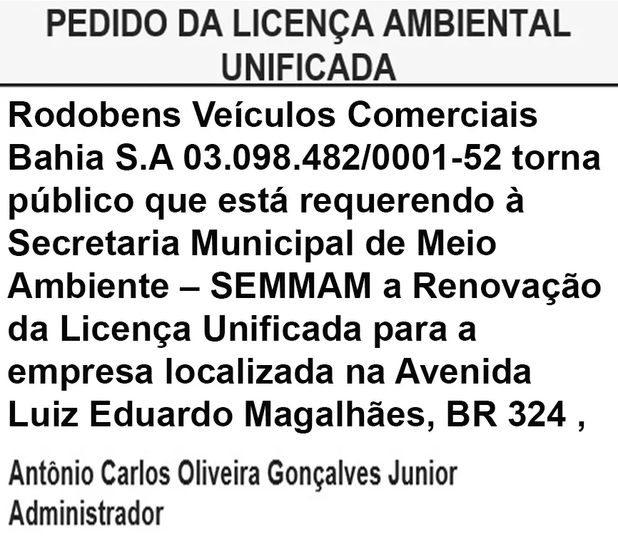 Rodobens Veículos Comerciais Bahia S.A 03.098.482/0001-52 torna público que está requerendo à Secretaria Municipal de Meio Ambiente – SEMMAM a Renovação da Licença Unificada para a empresa localizada na Avenida Luiz Eduardo Magalhães, BR 324 , s/n, bairro Subaé, Feira de Santana-BA